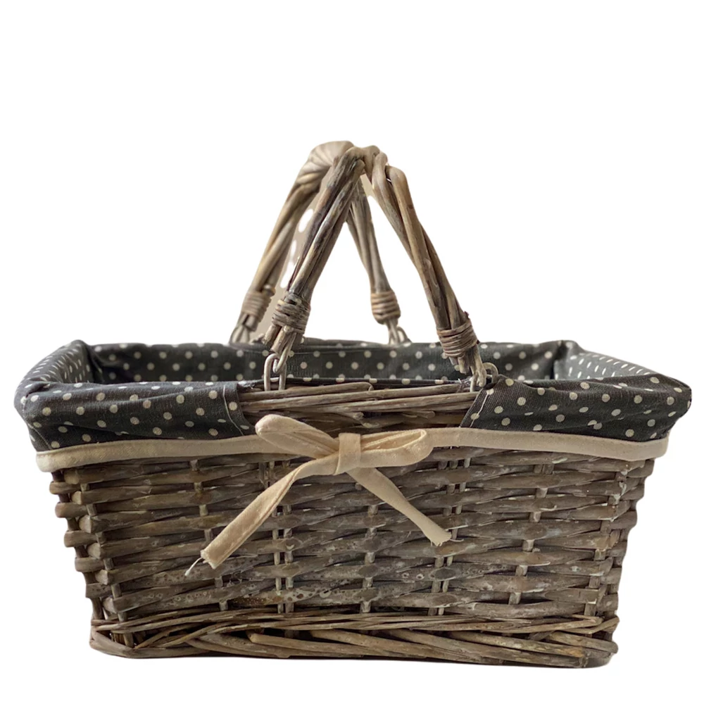 Textillel bélelt, fonott natúr vesszőkosár. Később akár tárolásra vagy más célra is használható dekoratív kosár.