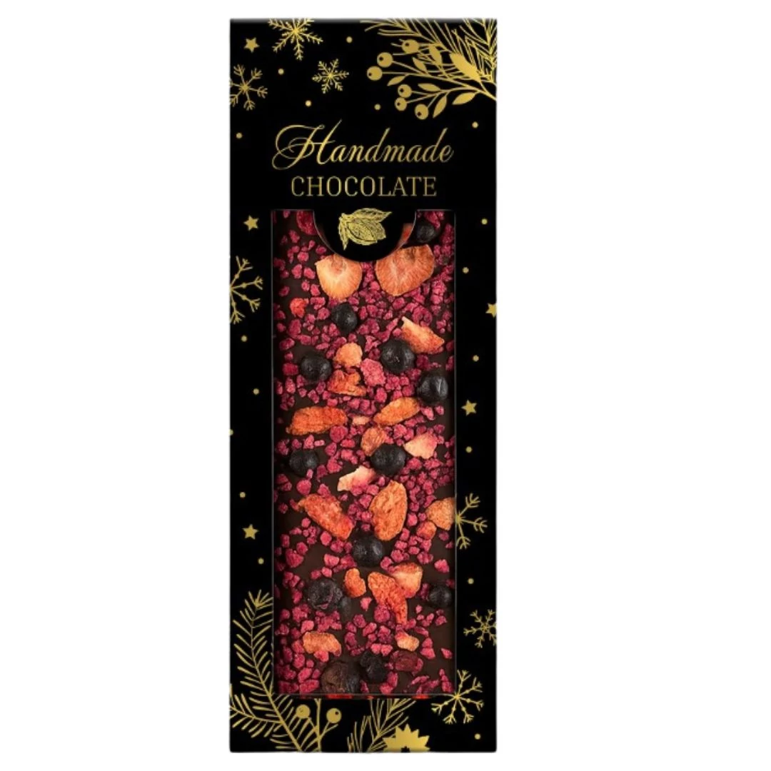 Kézműves epres csokoládé: Kézműves csokoládé liofilizált gyümölcs darabokkal.