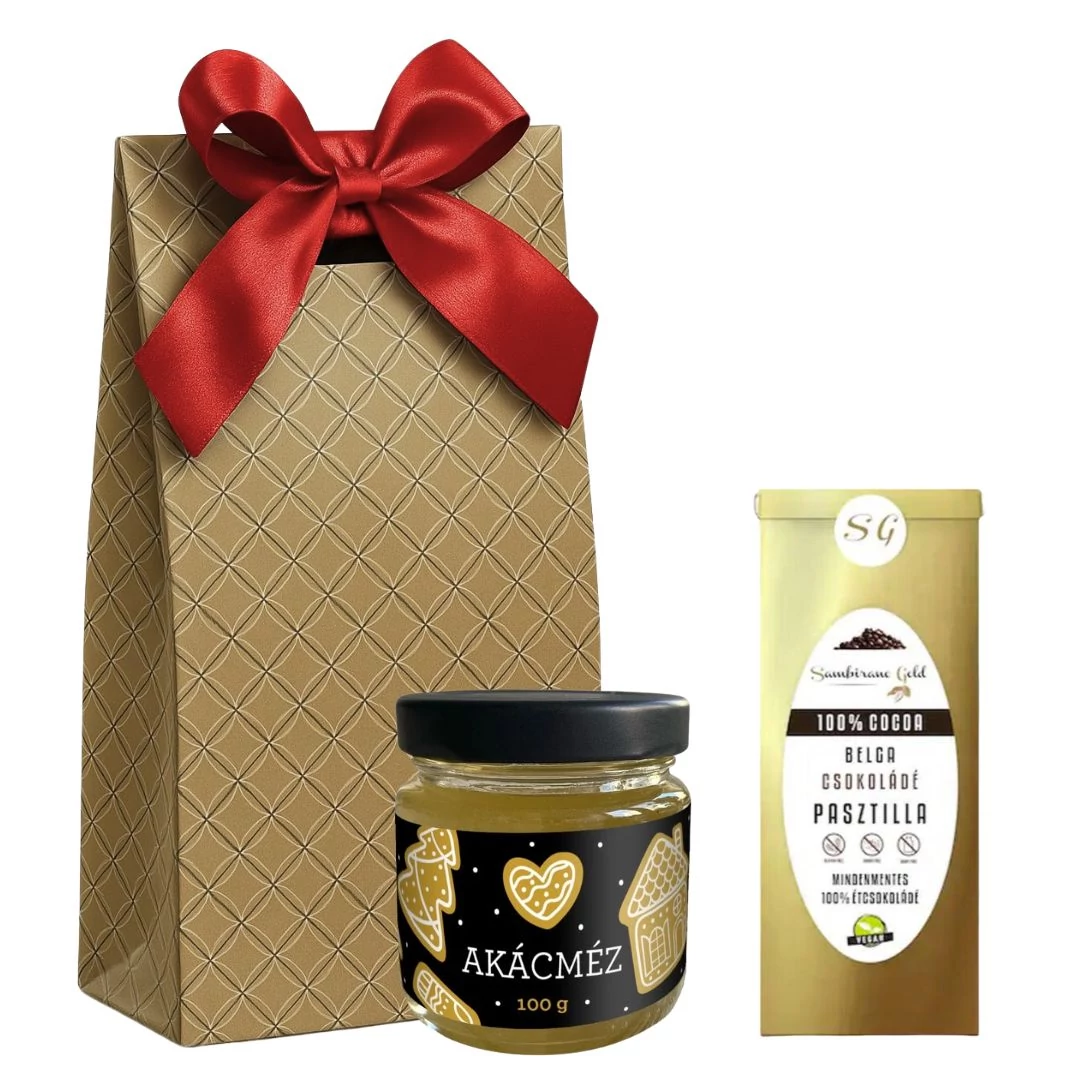 Mi is jellemezhetné jobban a karácsonyt mint az aranyló fények. A Gold duett karácsonyi ajándékbox ennek tudatában készült arany csomagolású csokoládé pasztilla és prémium akácméz termékekkel hozzáilló csomagolásban. Ha cégként vásárol, a csomagolást egyedivé teheti cége logójával.