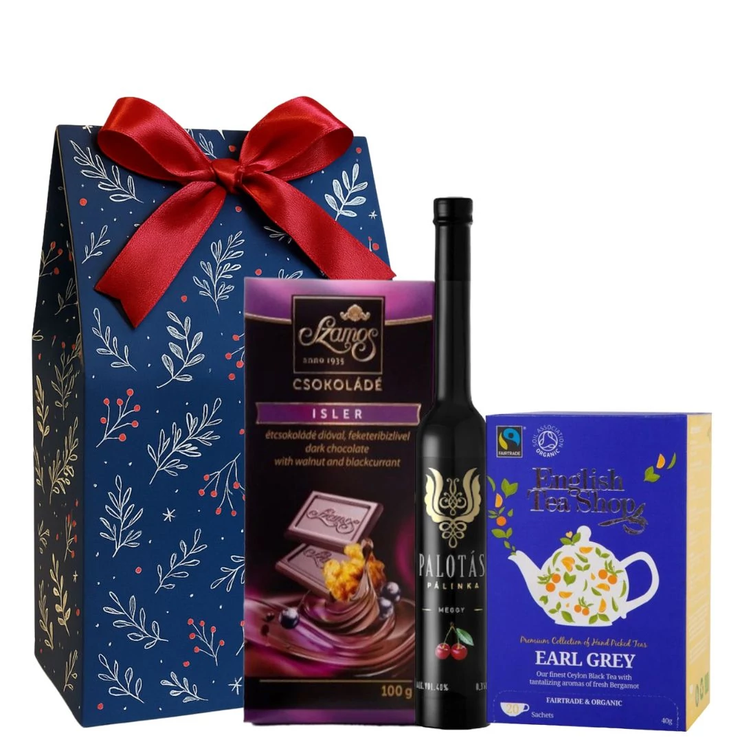 Kedves karácsonyi válogatás felnőtt szeretteink számára. Az összeállításban a klasszikus csokoládé és tea páros mellett zamatos meggypálinkát talál az ajándékozott. A prémium egyedi csomagolás teszi igazán különlegessé a karácsonyi ajándékcsomagot. Küldje ajándékba családtagnak, ismerősnek vagy akár kollégának!