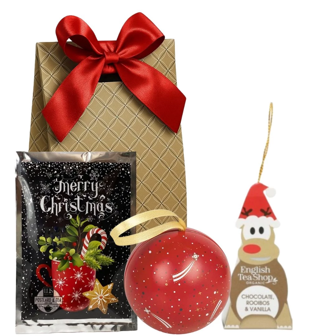 Karácsonyi tea: Karácsonyi mintájú angol tea mely akasztóval is rendelkezik.