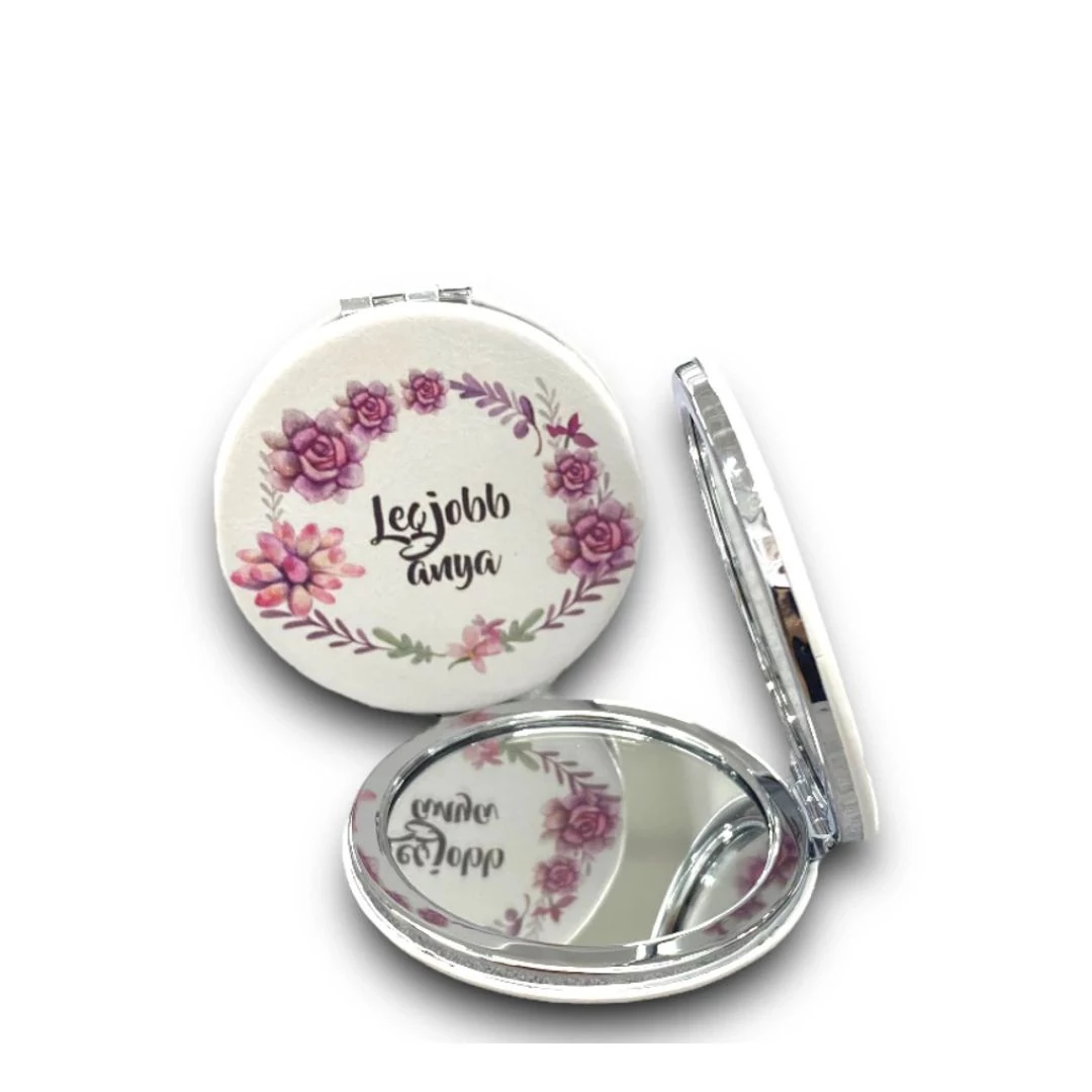 Legjobb anya pipere tükör: Virággal díszített kompakt tükör, amit bárhova magaddal vihetsz. Legjobb anya felirattal. 7 cm átmérőjű,nagyítós és sima tükörrel,összecsukható,