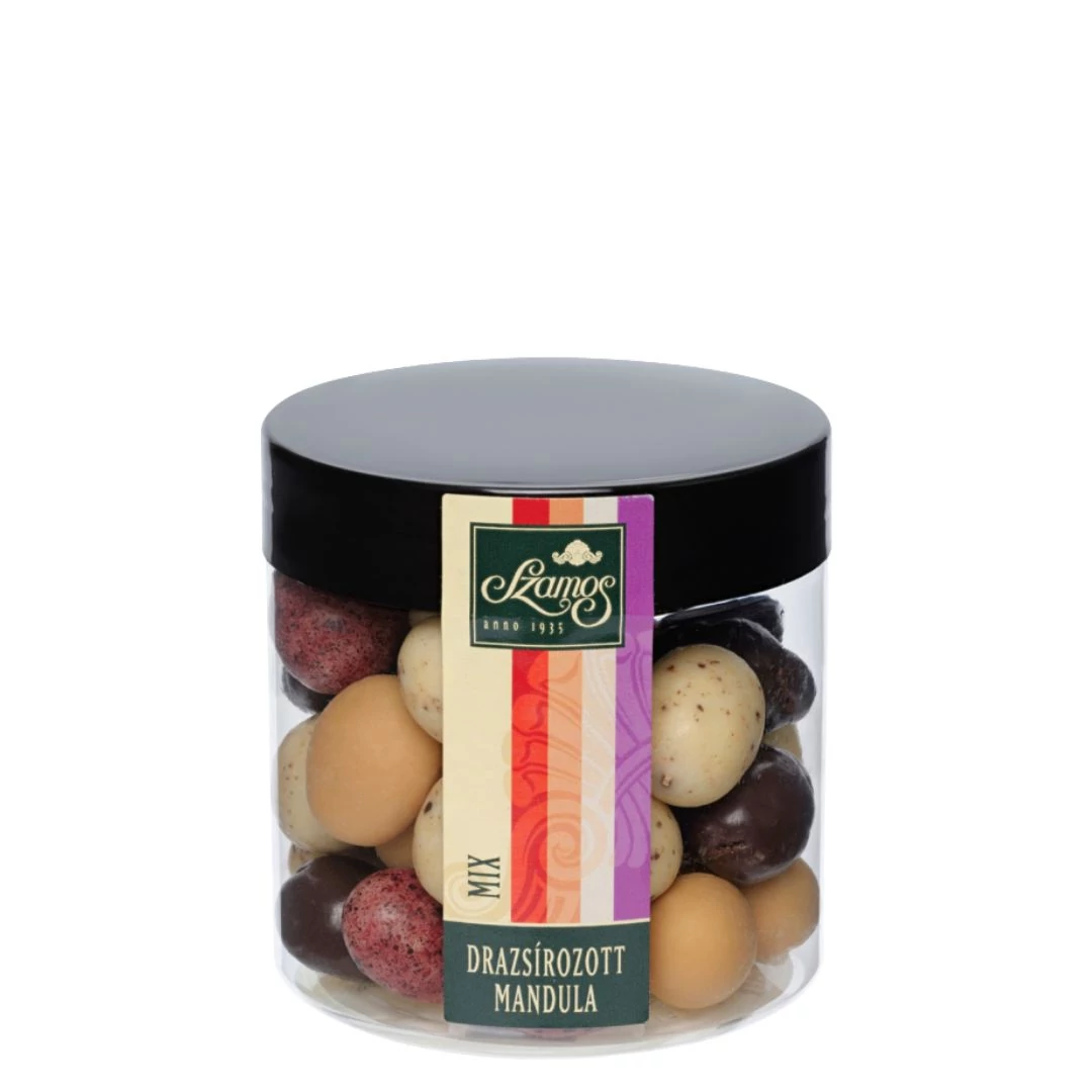 Szamos drazsírozott mandula mix: Pörkölt mandula válogatott csokoládébevonattal, ét-, feketeribizlis és karamelles fehércsokoládé.